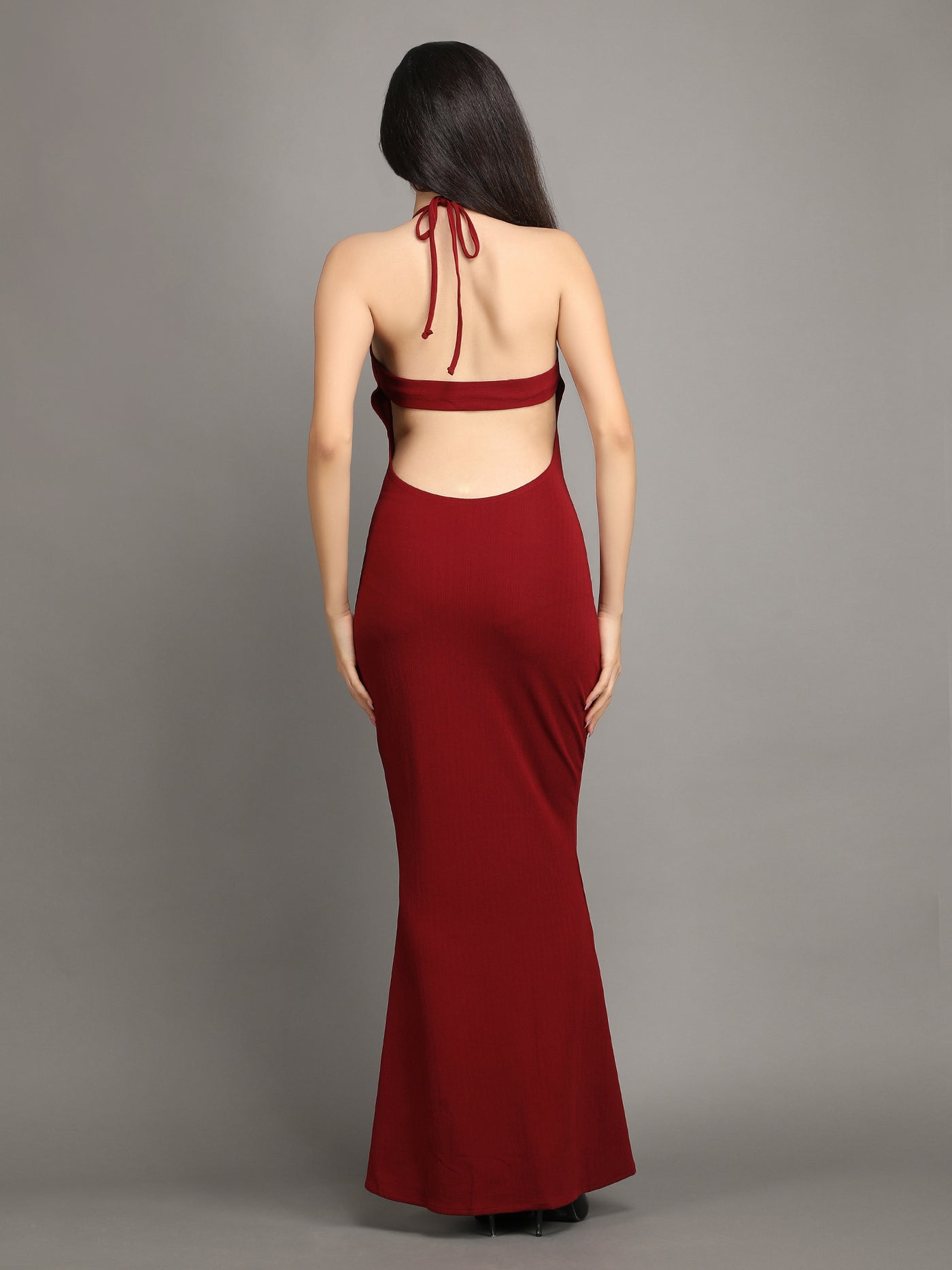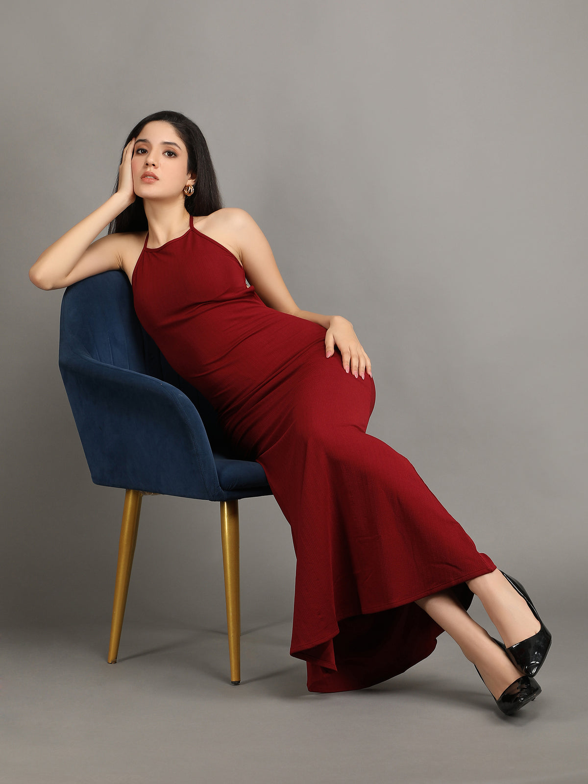 Step into effortless glamour with the Midnight Love Spell Red Dress, designed to captivate with its sleek silhouette and luxurious feel. This floor-length bodycon dress hugs your curves beautifully, featuring a graceful halter neckline that exudes confidence and sophistication.